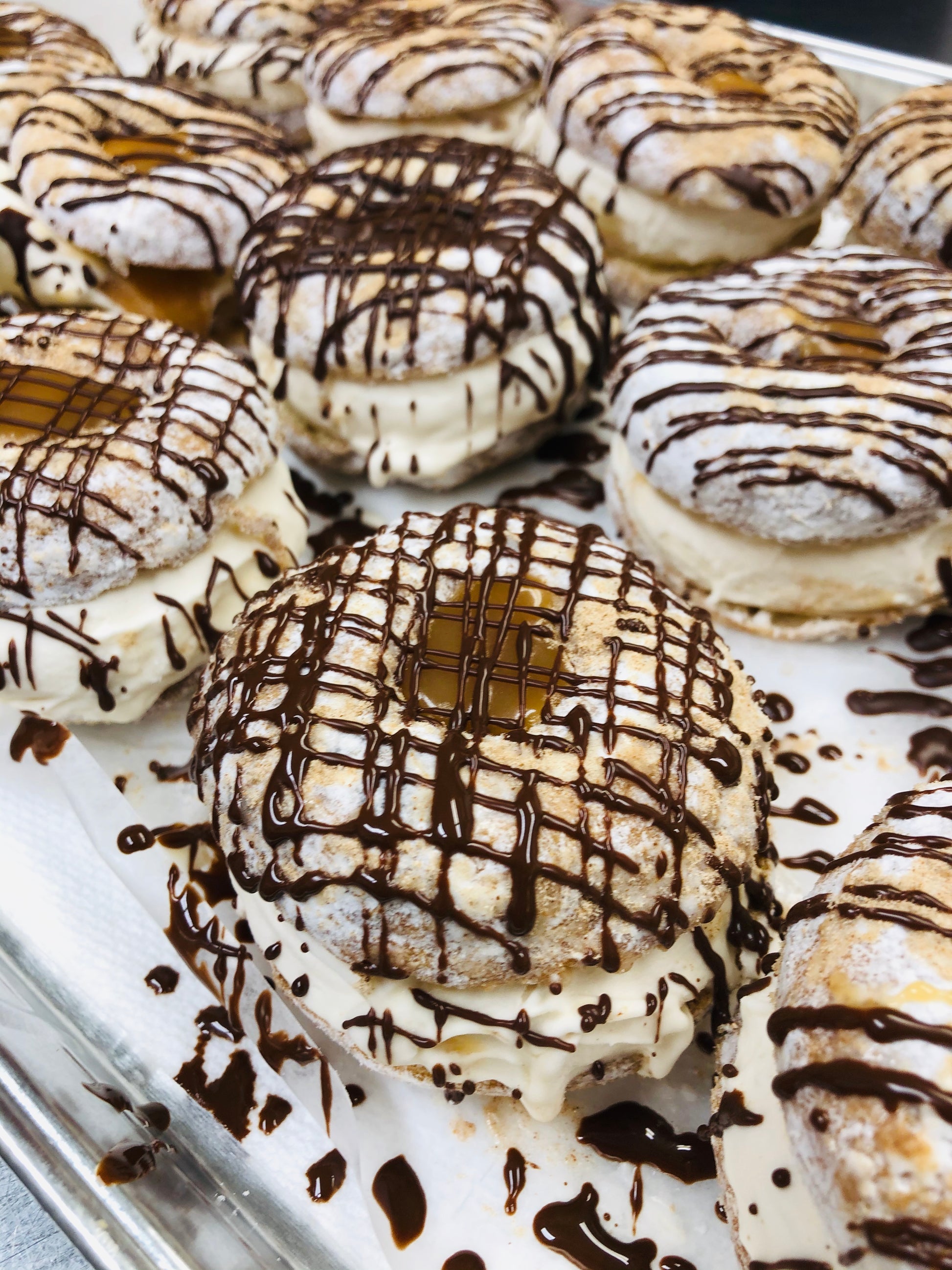 Caramel gelato with a caramel center, sandwiched inside a cinnamon donut, drizzled in chocolate and topped off with creamy thick caramel! No Nuts in this donut! Always parve