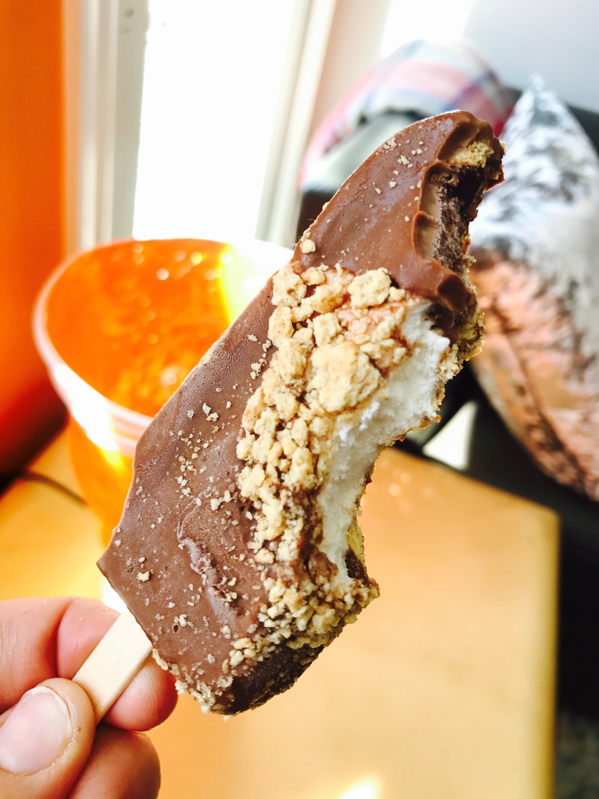 Chocolate gelato with a toasted s’more in the center and rolled in crushed graham crackers
